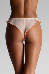 Perizoma in chiffon pastello con finiture fluo. Un taglio francese ultra-femminile con elastico in vita e delicati spacchi a balze allunga le gambe e rivela elegantemente i fianchi. Sfoderato per una trasparenza totale.