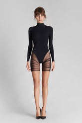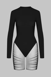 Tuta corta bimateriale a maniche lunghe. L'opacità del materiale ricopre la parte superiore del corpo con un effetto body a perizoma scollato e ornato da un collo alto. Chiusura con zip sul retro decorata con un gioiello dorato. I glutei e le gambe risaltano sotto un tulle completamente trasparente strutturato con pieghe e cuciture sui fianchi.