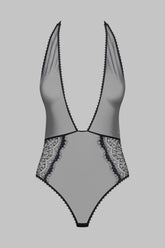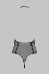 Body string en dentelle recyclée. Forme alliant une dentelle à cils et un tulle transparent bordé d’un élastique à picot. Coupe graphique qui souligne la silhouette grâce à son décolleté V plongeant et son dos nu. Fermeture par un élastique ajustable et une attache dorée dans le cou. Ouvrable et ajustable à l’entre jambe.