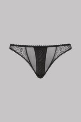 String ouvrable en dentelle recyclée. Forme alliant une dentelle rigide et un tulle transparent bordé d’un élastique à picot. Coupe graphique et structurée par deux pans ouvrables croisés de l’avant à l’arrière.