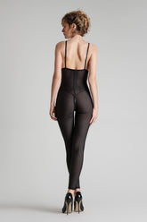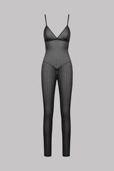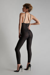 Catsuit en microfibre aux rayures ajourées, transparentes et graphiques. Une pièce hypnotisante qui allonge la silhouette. Bonnets triangles pour un décolleté plongeant. Ouvrable à l’entre jambe grâce à un zip allant de l’avant à l’arrière. Bretelles élastiques et réglables aux finitions argentées.