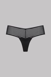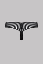 Tanga en microfibre aux rayures ajourées, transparentes et graphiques. Forme échancrée grâce aux larges bandes qui soulignent les hanches. Microfibre unie noire à l’entrejambe.