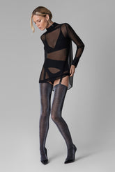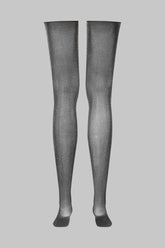 Les bas coupés roulés identitaires Maison Close dévoilent leur facette ultra-brillante. Le voile soyeux noir est tissé avec un fil Lurex® argenté pour un effet infiniment visuel. Associés aux robes Maison Close aux ouvertures vertigineuses, ils révèlent des jambes scintillantes tout en sophistication. Sensation douce sur la peau. Fabrication italienne dans un atelier d’exception.