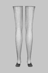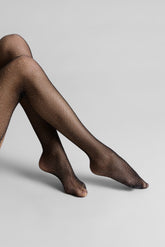 Bas coupés roulés identitaires Maison Close. La fine résille se pare d’un fil Lurex® argenté. Un effet ultra-scintillant tout en conservant la douceur de la résille. Associés aux robes Maison Close aux ouvertures vertigineuses, ils dévoilent des jambes brillantes tout en sophistication. Sans renfort aux pieds, assumez ouvertement les sandales à talons. Fabrication italienne dans un atelier d’exception.