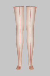 Bas coupés roulés identitaires de Maison Close. Coloris nude avec couture coloris rouge à l’arrière.