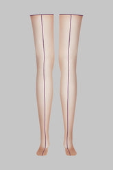 Bas coupés roulés identitaires de Maison Close. Coloris nude avec couture coloris violet à assortir avec la collection L’AMOUREUSE.