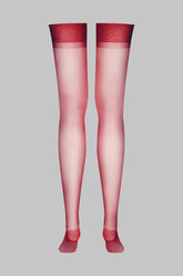Retenus par un porte-jarretelles Maison Close, ces bas nylon allongent la silhouette sans aucune démarcation. À monter jusque sous les fesses pour un effet cœur parfait.