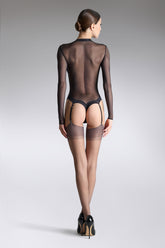 Retenus par un porte-jarretelles Maison Close, ces bas nylon allongent la silhouette sans aucune démarcation. À monter jusque sous les fesses pour un effet cœur parfait.