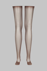 Bas coupés roulés identitaires de Maison Close. Voile transparent 20 deniers marron.