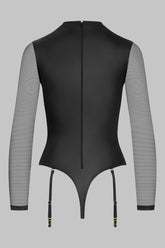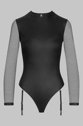 Body string manches longues qui joue un double effet-cuir mat et tulle transparent. Ouvrable au dos par un zip ton sur ton. Quatre porte-jarretelles amovibles et réglables aux accessoires dorés. Signature de la collection, un anneau « féti-chic » doré orne le col et suggère l’attachement.Une lingerie impudique qui se transforme en une pièce de prêt-à-porter tendance, à montrer de jour comme de nuit.