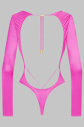 Body string échancré manches longues alliant douceur satinée et style unique. Un décolleté V plongeant et suggestif sublime la silhouette. Le dos est complètement dévoilé par un jeu de laçage délicatement plissé jusqu’au creux des reins. Le laçage dans le cou est ajustable grâce à un régleur unique et des accessoires lipstick dorés signés Maison Close. Fermeture ajustable par un agrafage à l’entrejambe.