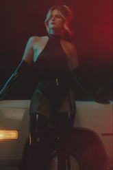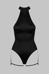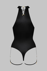 Body string encolure américaine alliant douceur satinée et style élégant. Une encolure américaine échancrée sur les côtés sublime la silhouette. Col montant ouvrable par un jeu de laçage délicatement plissé grâce à un régleur unique et des accessoires lipstick dorés signés Maison Close. Les deux jarretières amovibles aux accessoires dorés, appellent des bas, pour magnifier le tout. Fermeture ajustable par un agrafage à l’entrejambe.