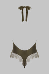 Body string encolure américaine en soie et dentelle à cils. Coupe échancrée orné d’une dentelle rigide qui dévoile les hanches et les fesses avec subtilité. Une encolure américaine révèle délicatement le buste. Fermeture dans le cou par un ruban de soie à nouer selon vos envies. Non ouvrable à l’entre-jambe pour un meilleur confort.