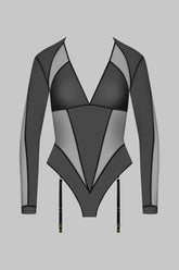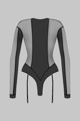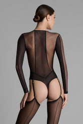 Le body string manches longues L’AMOUREUSE, en tulle d’une transparence absolue, est structuré par un jeu de coutures et de tulle doublé qui viennent dessiner la silhouette et souligner la taille. Des jarretelles réglables et amovibles permettent de l’associer à des bas. Le body est ouvrable et ajustable à l’entrejambe par un agrafage.