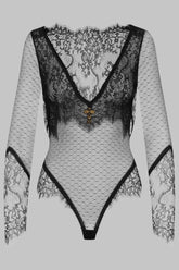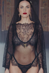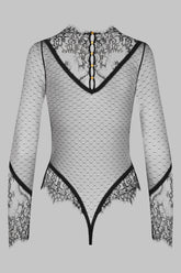 Body string manches longues alliant une dentelle à cils rigide et un tulle plumetis extensible. Un voile de dentelle déboutonnable dévoile en transparence un décolleté plongeant, orné d’une croix gravée Inspiration Divine. Fermeture ajustable par un agrafage à l’entrejambe et une boutonnière au dos.Une pièce Iconique de la collection à porter en accord avec la jupe porte-jarretelles Inspiration Divine.