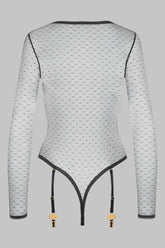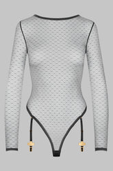Body string manches longues en tulle plumetis extensible. Coutures en élastiques picots qui structure la silhouette. Quatre jarretelles élastiques amovibles et réglables ornées par des croix dorées. Fermeture ajustable par un agrafage à l’entrejambe.Une lingerie à jouer en Mix & Match. À porter de jour comme de nuit associée à nos bas coupés roulés ou superposée à un soutien-gorge Inspiration Divine.