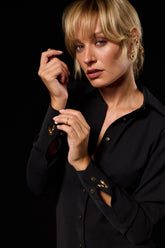 Les boutons de manchette Lapin sont à la fois accessoire et bijou. Réalisés à partir d’un moule exclusif, ils reprennent les lignes de notre masque iconique. Leur système pivotant au dos permet une attache simple et fluide sur une chemise mousquetaire, qu’elle soit masculine ou féminine.