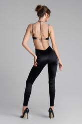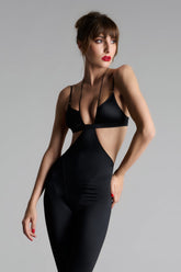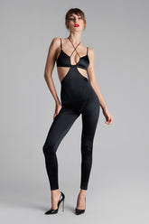 Catsuit encolure brassière alliant douceur satinée et style unique. Les bonnets sans couture sont élégamment structurés par un plissé au décolleté. Le laçage tour de cou, repositionnable et ajustable grâce à un régleur unique et des accessoires lipstick dorés signés Maison Close, sublime votre décolleté tout en permettant une personnalisation selon vos envies. Les fines bretelles plates et ajustables assurent un ajustement parfait. Une bande élastique en tour de buste épouse et galbe parfaitement la poitrine. Fermeture par agrafage ajustable au dos. L'empiècement string échancré au dos allonge gracieusement la silhouette, ajoutant une touche de sensualité à cette pièce exceptionnelle.