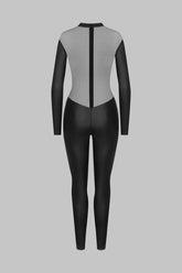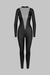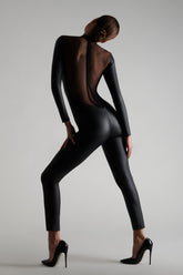 Catsuit qui joue un double effet-cuir mat et tulle transparent. Découpes graphiques en tulle V plongeant qui sublime le décolleté et dévoile le dos. Fermeture de l’avant au dos par un zip double sens ton sur ton. Signature de la collection, un anneau « féti-chic » doré orne le col et suggère l’attachement.