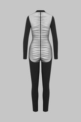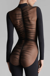 Catsuit manches longues bi-matière, le dos s’affirme sous un tulle entièrement transparent structuré de plis-couture assumé jusque sous les fesses. À l’avant une matière entièrement opaque joue la double lecture clair-obscur. S’y dessine l’ouverture, depuis le col montant, par un zip au bijou doré.