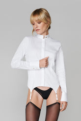 Associée aux jupes et pantalons du vestiaire ou aux pièces de lingerie Maison Close, la chemise porte-jarretelles peut créer une multitude de looks assumés.