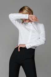 La chemise se distingue par sa coupe cintrée et structurée qui dessine les courbes de manière audacieuse. Confectionnée en popeline de coton blanc stretch alliant la douceur, la juste épaisseur et une qualité incomparable.