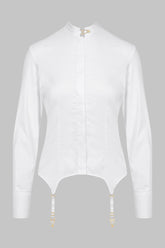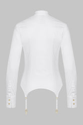 La chemise est agrémentée d’un col officier orné d’une attache jarretelle en métal doré ouvrable, d’une fermeture à l’avant par des boutons blancs gravés Maison Close recouverte d’une patte de boutonnage qui assure une finition épurée. Les manches longues et droites à pattes capucin se ferment grâce à deux boutons en métal doré.