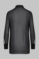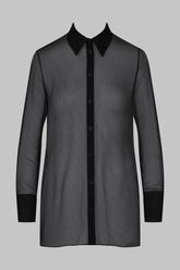 La chemise longue transparente se distingue par sa coupe droite et son col français. Confectionnée en mousseline ultra transparente, vaporeuse et fluide, cette pièce audacieuse attire l’attention par sa légèreté. La patte de boutonnage et les poignets de cette chemise sont ornés par des boutons gravés Maison Close, ajoutant une touche de personnalisation.