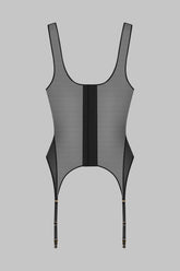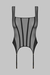 Le corset porte-jarretelles L’AMOUREUSE, en tulle d’une transparence absolue, adopte une combinaison esprit vintage avec décolleté droit et jeu de coutures transversales, structuré par des baleines verticales souples. Le tulle doublé sur les côtés sublime les hanches et se prolonge en jarretelles réglables et amovibles. Fermeture au dos par un agrafage lisse et fin.