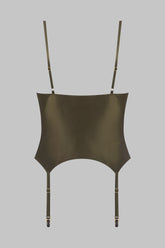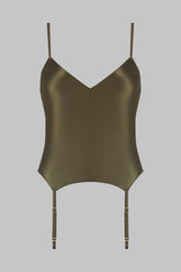 Combinaison porte-jarretelles en soie naturelle. Un décolleté V épouse délicatement le buste. Quatre jarretelles fixes et ajustables aux finitions dorées. Bretelles en soie réglables aux accessoires dorés.