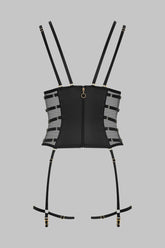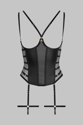 Corset seins nus avec armatures qui joue un double effet-cuir mat et tulle transparent. Une pièce aux découpes graphiques harnachée de straps élastiques réglables sur les côtés. Coupe ajustée qui souligne la taille. Jarretelles type jarretières, bretelles et harnais tour de cou amovibles et réglables par des accessoires dorées. Baleines souples verticales pour plus de structure et de maintien. Fermeture zip au dos.
