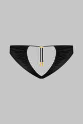 Culotte ouverte, alliant douceur satinée et style. Conçue pour dévoiler élégamment de jolies fesses cœur. L'ouverture, ornée d'un laçage plissé, galbe parfaitement les fesses et permet un ajustement personnalisé grâce à un régleur unique et des accessoires lipstick dorés signés Maison Close.