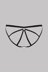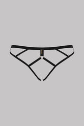 La culotte ouverte PARURE VELOURS joue sur l’épure et la suggestion. Conçue en velours doux au toucher, elle dévoile une structure ouverte à la géométrie travaillée, ponctuée d’une pampille dorée gravée Maison Close. Pensée pour être portée seule ou attachée au harnais assorti, elle permet de créer l’illusion d’un body. Elle épouse la morphologie avec précision et discrétion. Un dessous trompe l'œil, minimal et graphique.