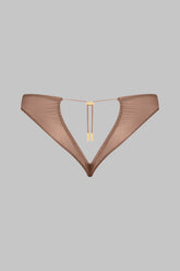 Culotte ouverte, élaborée dans un jersey fin aux reflets brillants et subtilement transparents. Conçue pour dévoiler élégamment de jolies fesses coeur. L'ouverture, ornée d'un laçage plissé, galbe parfaitement les fesses et permet un ajustement personnalisé grâce à un régleur unique et des accessoires lipstick dorés signés Maison Close.