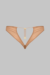 Culotte ouverte, élaborée dans un jersey fin aux reflets brillants et subtilement transparents. Conçue pour dévoiler élégamment de jolies fesses coeur. L'ouverture, ornée d'un laçage plissé, galbe parfaitement les fesses et permet un ajustement personnalisé grâce à un régleur unique et des accessoires lipstick dorés signés Maison Close.