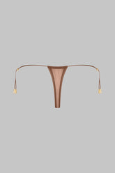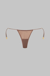 Mini string élaboré dans un jersey fin aux reflets brillants et subtilement transparents. Une coupe iconique incontournable. Délicatement plissé à l'avant et à l'arrière, il offre un ajustement élégant. Le jeu de laçage sur les côtés est ajustable grâce à un régleur unique et des accessoires lipstick dorés signés Maison Close à ajuster selon vos envies !
