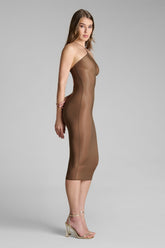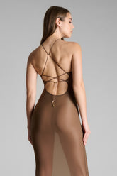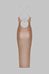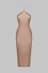 Robe longueur midi à encolure semi-américaine élaboré dans un jersey fin aux reflets brillants et subtilement transparents. Le dos nu est sublimé par un jeu de laçage, le tour de cou est ajustable grâce des régleurs uniques et des accessoires lipstick dorés signés Maison Close.