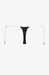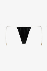 Bas de maillot de bain mini string alliant douceur satinée et une coupe iconique incontournable. Délicatement plissé à l'avant et à l'arrière, ce maillot offre un ajustement élégant. Le jeu de laçage sur les côtés est ajustable grâce à un régleur unique et des accessoires lipstick dorés signés Maison Close à ajuster selon vos envies.