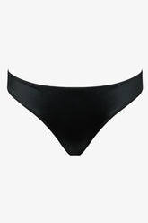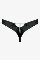Bas de maillot de bain tanga échancré, alliant douceur satinée et style. Maillot conçu pour dévoiler élégamment le creux des reins. L'ouverture, ornée d'un laçage plissé, galbe parfaitement les fesses et permet un ajustement personnalisé grâce à un régleur unique et des accessoires lipstick dorés signés Maison Close.