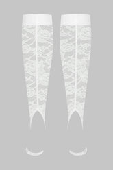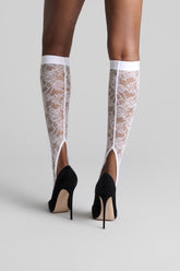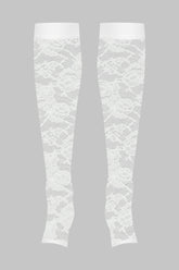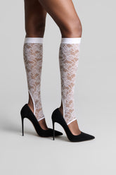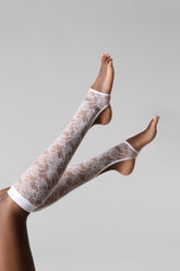 Les guêtres se parent d’une dentelle ajourée majoritairement recyclée. Coupe ajustée bordée d’un élastique plat. Ouverture échancrée à l’arrière de la jambe. Pointes des pieds ouvertes.