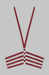 Harnais signé Maison Close. Une accumulation d’anneaux argents très fins et des élastiques ruban bordeaux en font un accessoire bijou qui vient habiller la nudité. Réglable et ajustable à toutes les morphologies.