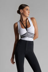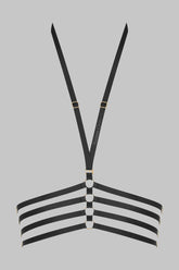 Harnais Parure Signature signé Maison Close. Une accumulation d’anneaux dorés très fins et des élastiques ruban en font un accessoire bijou qui vient habiller la nudité. Réglable et ajustable à toutes les morphologies.