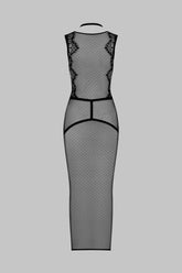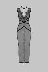 Robe longue sans manches alliant une dentelle gothique et un tulle plumetis extensible. Jeu de coutures en élastiques picots qui structure la silhouette. Ornée d’un harnais réglable et amovible à attacher par une croix dorée aux différents boutons.La robe ajustée se transforme en une pièce de prêt-à-porter spirituelle, à porter de jour comme de nuit.