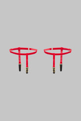 Les jarretières PARURE VELOURS rouge soulignent les jambes avec élégance. Réalisées en velours doux au toucher, elles sont entièrement ajustables pour s’adapter à toutes les morphologies. Dotées de jarretelles dorées, elles permettent d’associer élégamment une paire de bas. À porter seules ou coordonnées avec la culotte et le harnais de la ligne. Un accessoire de liaison entre le corps et le détail.