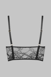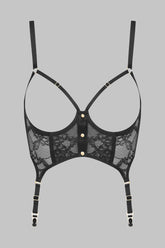 Le Bustier Porte-Jarretelles JEUX MAGNÉTIQUES joue l’audace et la séduction dans une composition délicate de dentelle florale. À l’avant, le soutien-gorge ouvert à armatures révèle la poitrine et s’ouvre d’un simple geste grâce à ses boutons magnétiques dorés. Les élastiques au décolleté s’ajustent à la silhouette pour une tenue sur-mesure. Les bretelles réglables assurent un maintien parfait, tandis que les jarretelles amovibles permettent d’associer la pièce au micro-string jarretières assorti ou à d’autres bas de la collection. Un bustier pensé pour orchestrer le désir avec précision, et révéler l’instant avec style.