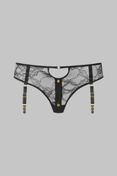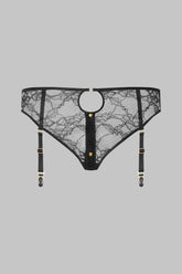 La Culotte Porte-Jarretelles JEUX MAGNÉTIQUES dévoile un jeu de lignes et de textures pensé pour séduire. En dentelle florale extensible, elle se porte taille basse et s’ouvre à l’avant grâce à un bouton aimanté doré discret. Deux découpes en goutte, placées à l’avant et au creux des reins, soulignent la silhouette avec audace. Les jarretelles, amovibles et réglables, sont habillées de finitions métalliques dorées pour une allure aussi élégante que magnétique. À coordonner selon l’envie avec les bas de la collection.