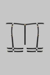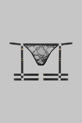 Le Mini-string Jarretières JEUX MAGNÉTIQUES transforme la lingerie en terrain de jeu. Confectionné en dentelle florale extensible, il s’accompagne de jarretières amovibles, entièrement réglables et fixées par des boutons magnétiques dorés. La taille se module grâce à deux attaches dorées sur les côtés, tandis qu’un bouton aimanté placé à l’arrière permet d’ouvrir entièrement le string. Une pièce ludique et versatile, pensée pour suivre le rythme du désir.