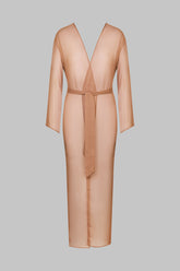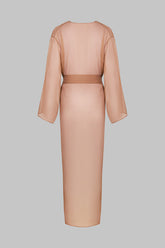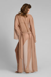 Léger comme une caresse, le kimono Sienne Fever enveloppe le corps d’un voile vaporeux à la transparence subtile. Sa coupe longue et droite se prolonge en manches larges, dessinant une silhouette fluide et aérienne. Une ceinture amovible, glissée dans deux passants latéraux, permet de jouer entre un port libre et une taille soulignée.