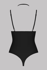 Body string ouvert en microfibre opaque bordé d’élastiques à picots. Coupe ajustée et structurée par deux pans croisés à l’avant et ouvrable à l’entre-jambe. Décolleté graphique sous poitrine prolongé par un harnais élastique à picots. Bretelles réglables par des accessoires ton sur ton.Le petit cadeau parfait à glisser dans son sac pour partir en week-end.