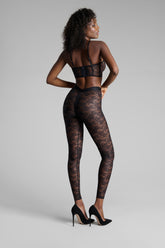 Le legging se pare d’une dentelle ajourée majoritairement recyclée. Une large ceinture bordée d’un élastique plat, souligne les courbes pour un style années 80 assumé.